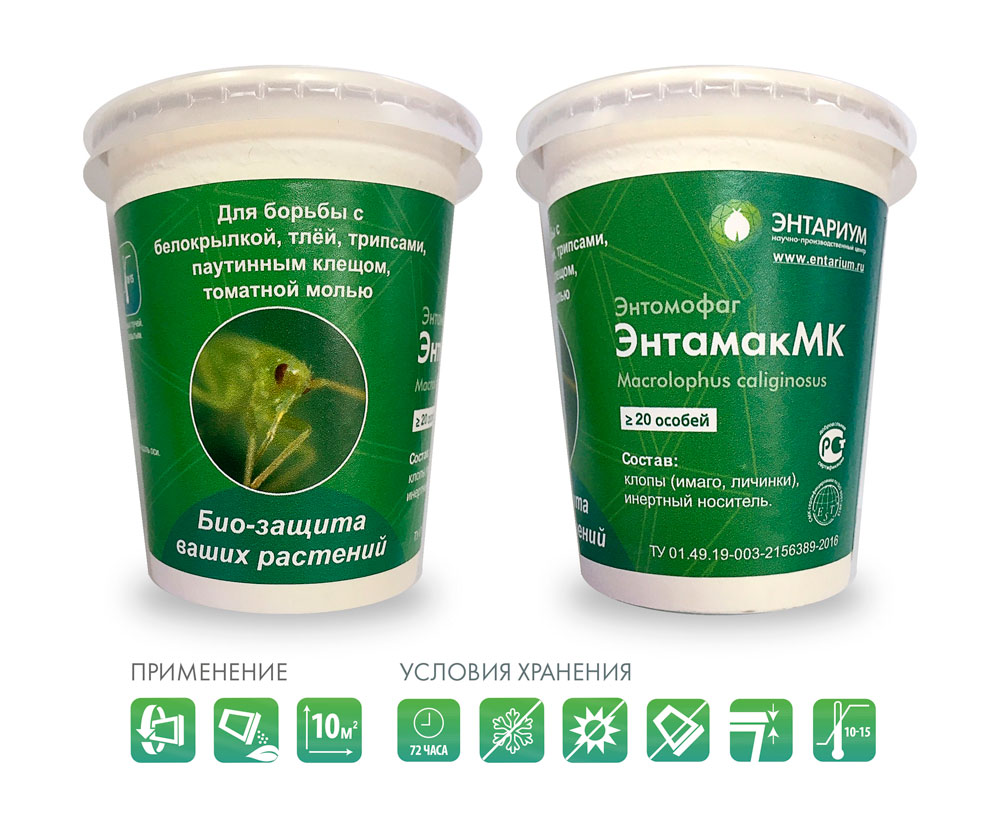 От одной самки появляется от 30 до 50 особей. При питании белокрылкой развитие личинок происходит за 22 дня. Продолжительность жизни самки – 71 день (в среднем – 30), самцов – 27 дней. Плодовитость самок – от 70 до 80 яиц, потенциальная 140 яиц. Повышение температуры до 30˚С и выше резко снижает плодовитость. Наиболее прожорливы личинки старших возрастов, а младших и взрослых – менее активные хищники. Для макролофуса оптимальны температуры от 23 до 30˚С. При увеличении температур ускоряется развитие и укорачивается период эффективности клопа. Для защиты растения от белокрылки, клопа накапливают в теплице задолго до появления вредителей, выпуская в 2-3 приема по 1 особи/м2 В случае средней и высокой плотности заселения культуры вредителем макролофус выселяют 4-6 особей на 1м 2. Выпуск проводят рано утром или вечером, следует избегать применения в ясный солнечный день.